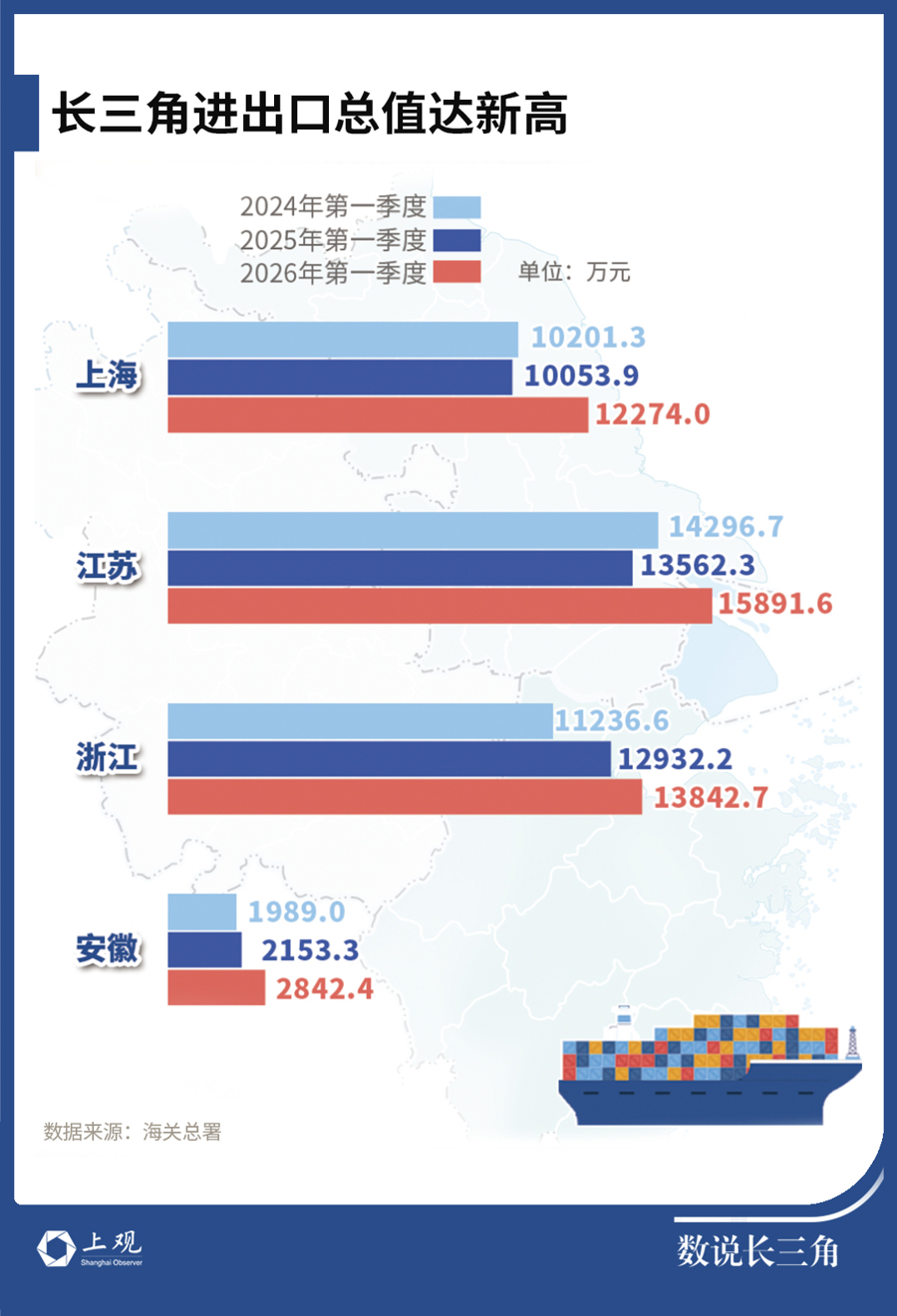 上海社会科学院世界经济研究所助理研究员吴真如认为,长三角一季度外贸创新高,本质上是前沿科技与高端制造发力的结果,标志着区域外贸已从规模扩张转向以产业升级为核心的结构性跃升。