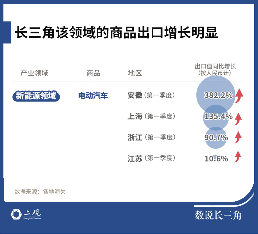 浙江新能源汽车一季度同比增长了90.7%,安徽省一季度电动车出口值同比增长更是达到382.2%,增速明显。