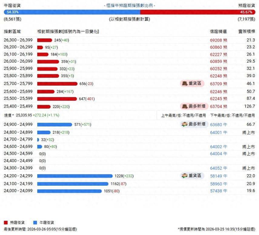 智通财经APP获悉,截至3月26日,恒指最新的牛熊街货比例为54:46。
