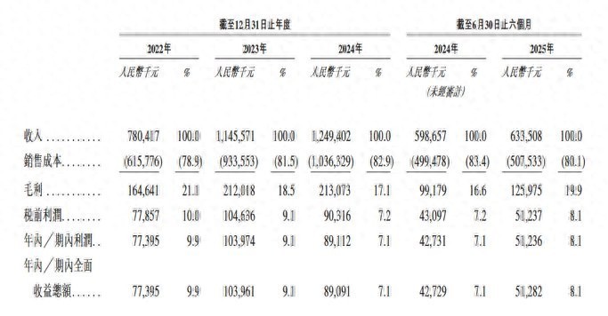 财务数据清晰呈现出一条令人担忧的"剪刀差"曲线:营收从2022年的7.8亿元增长至2024年的12.49亿元,增幅超六成;但净利润却从2023年的1.04亿元峰值大幅回落至2024年的8911万元,同比下滑14.3%。毛利率由2022年的21.1%持续走低至2024年的17.1%,净利润率则从9.9%阶梯式下行至7.1%——这意味着同样的100元收入,公司的实际盈利能力三年间已缩水近三成。